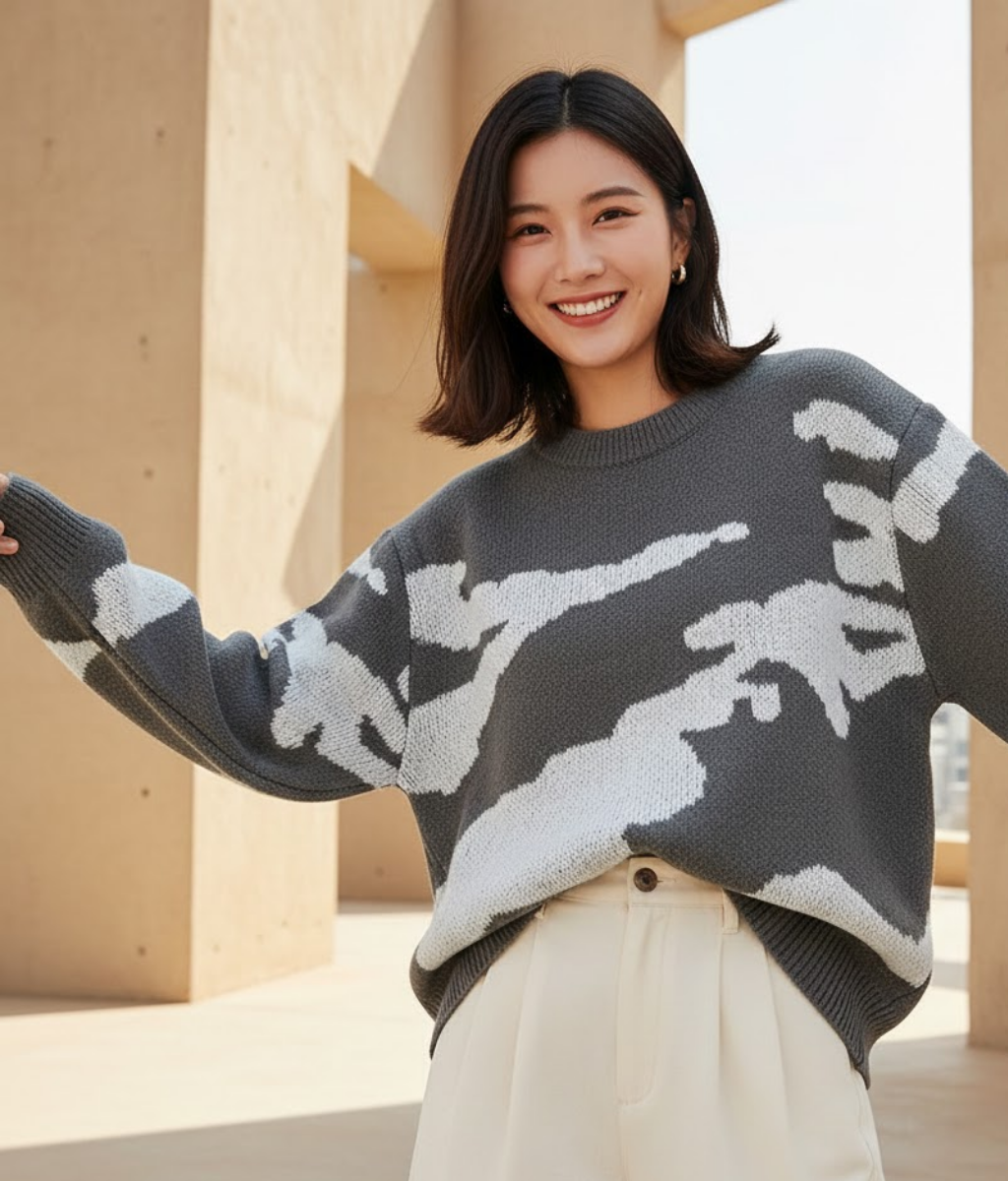 จุดสังเกตสำคัญ: เสื้อถักแบบนี้ถ้าเลือกไซส์พอดีตัวเกินไป (Slim Fit) จะทำให้ลวดลายก้อนเมฆดูเพี้ยนและเสียลุค High-end ครับ