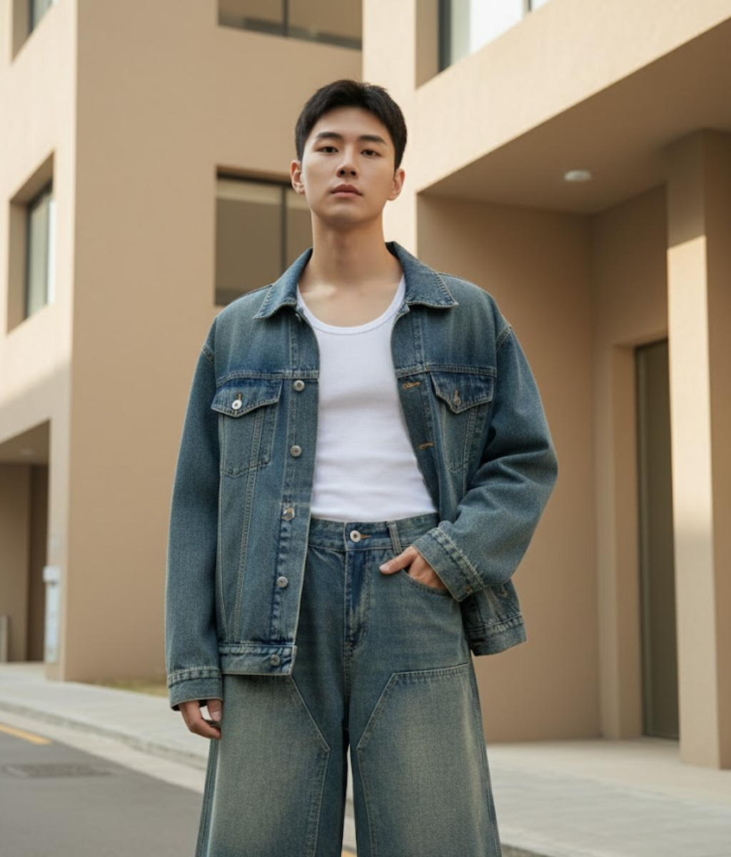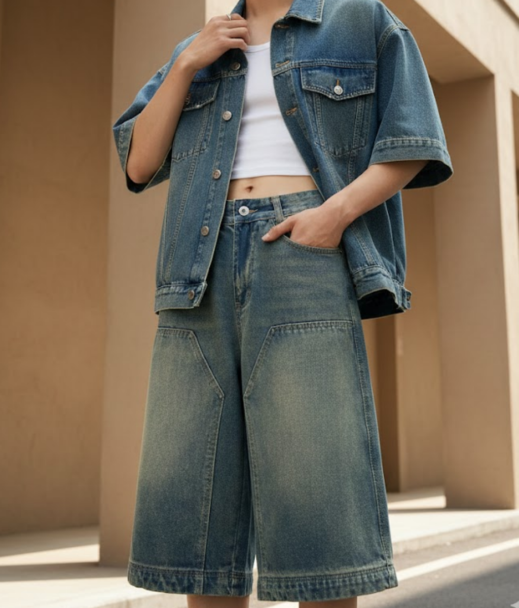 ทรงกางเกง: เป็นทรง Jorts (Jean Shorts) แบบขากว้าง (Wide-leg) หรือทรงกระบอกใหญ่พิเศษ ซึ่งจะมีความยาวคลุมเข่า (Below the knee) ให้ลุคแบบบอยๆ หรือสไตล์สเก็ตเตอร์